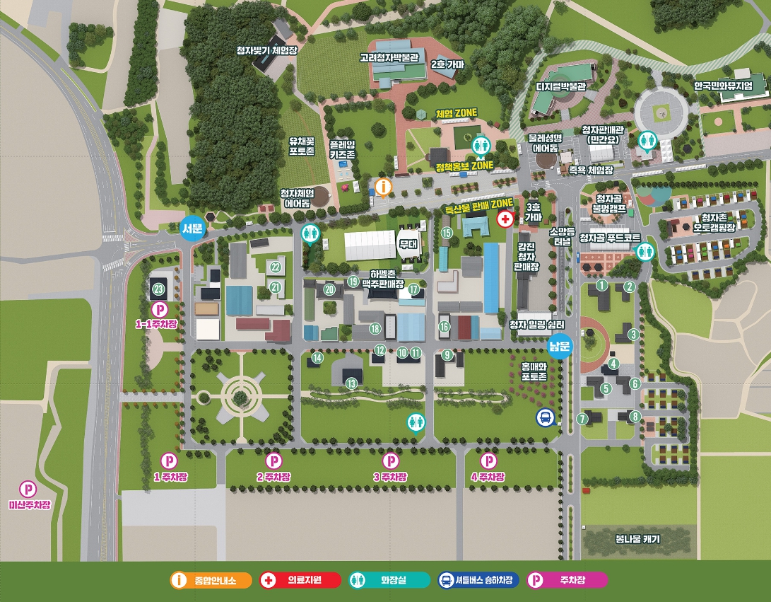 - 주차장 : 1주차장, 1-1주차장, 2주차장, 3주차장, 4주차장