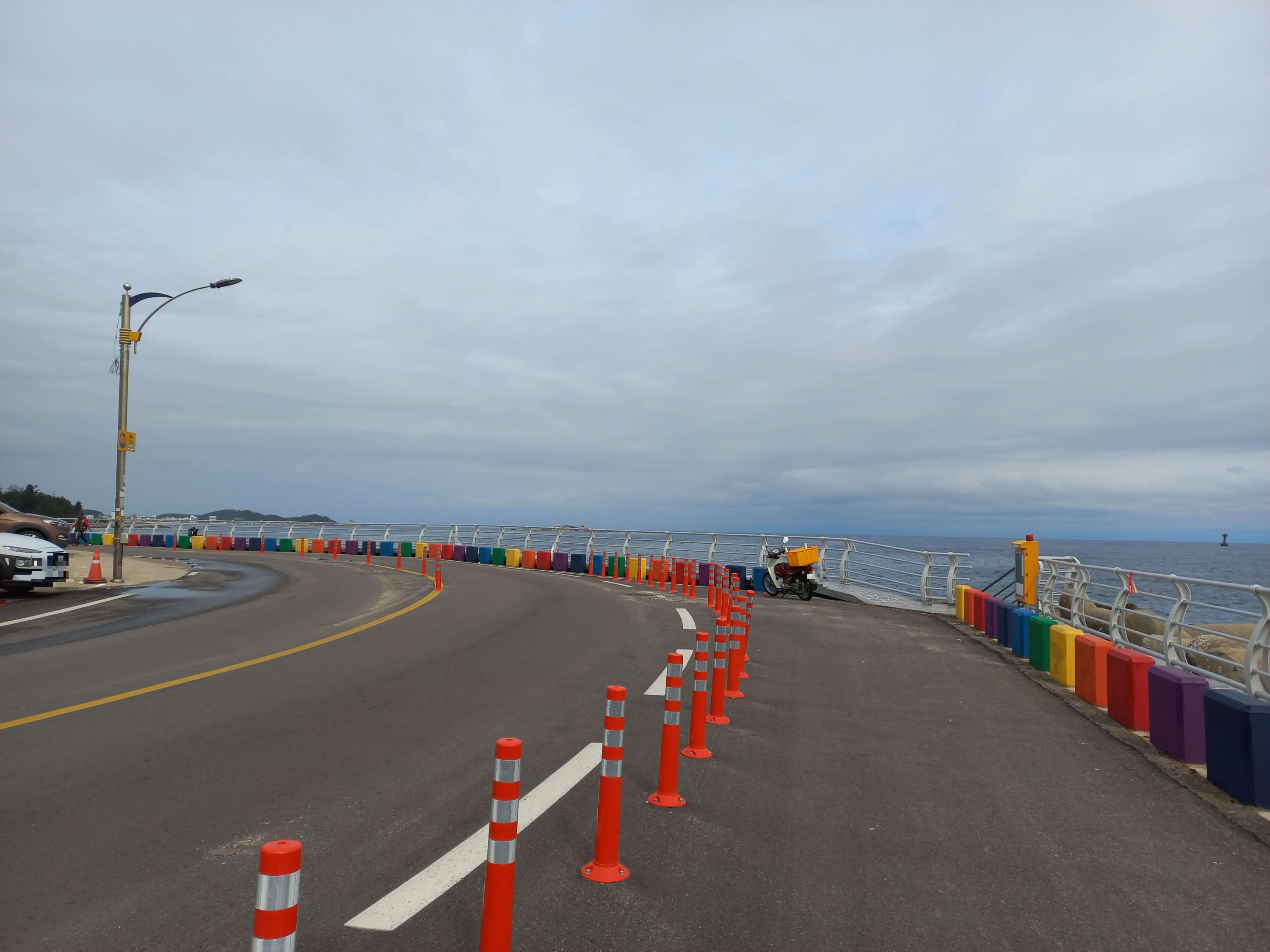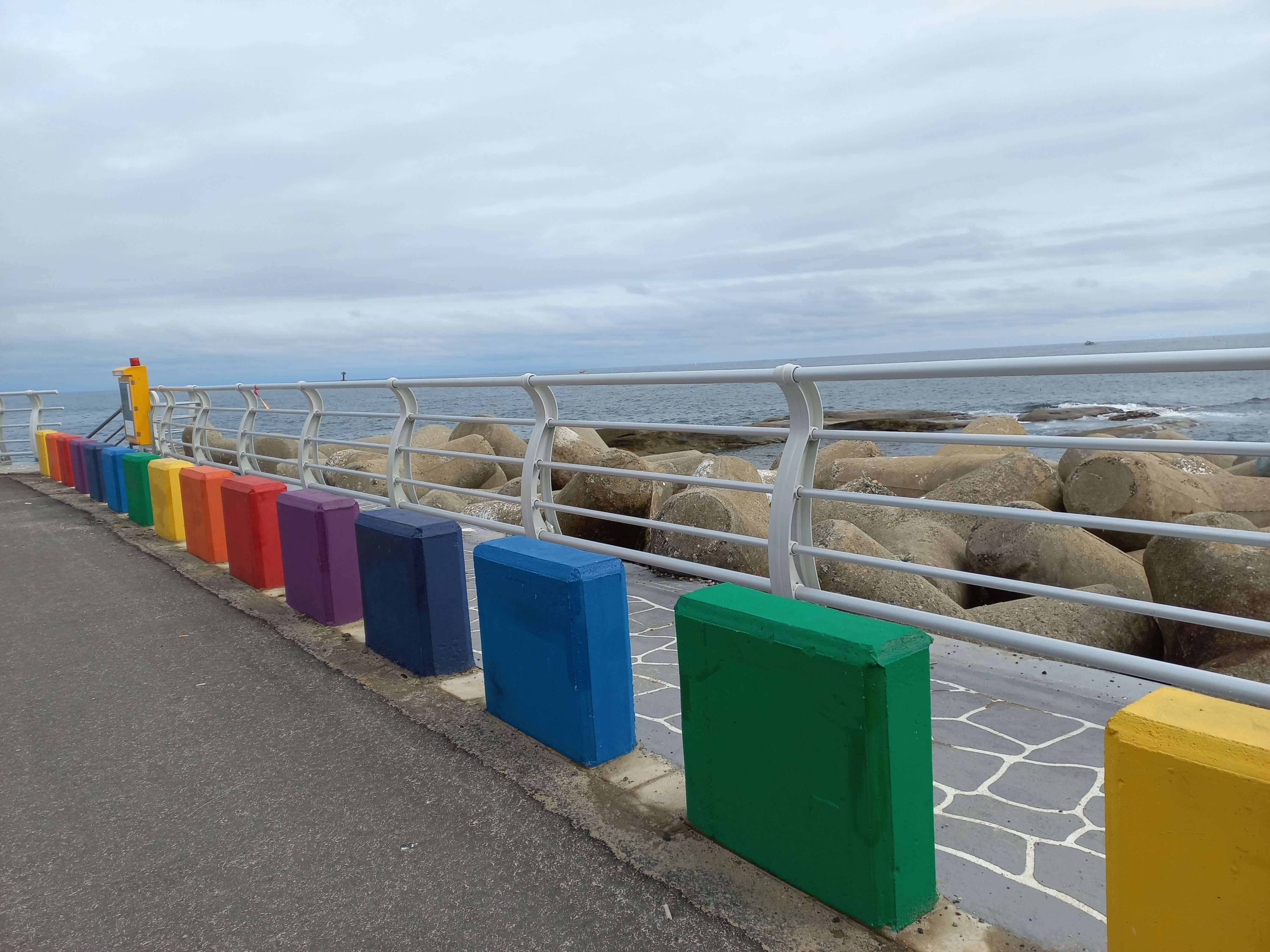 해변을 따라 줄지어 있는 알록달록 무지개색 돌다리