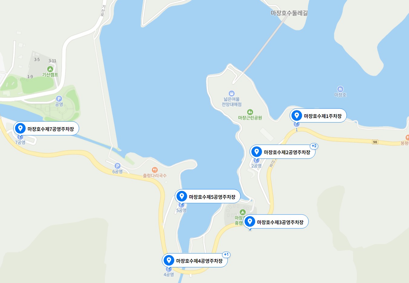 마장호수 제1,2공영주차장이 출렁다리와 근접한 주차장입니다